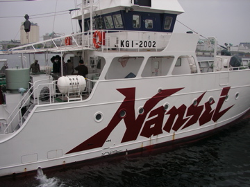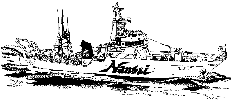 2002年12月,新南星丸が就航しました。大きさも2倍以上となり沿岸域での実習も充実するようになりました。 ここでは新旧の南星丸を絵で紹介します。 新南星丸のデザインは,建造前の完成予想図をもとに計画されていきました。ファンネルマークや船側の「NansEi」の文字は藤枝の作品です。※南星丸のファンネルマーク:南に輝く太陽をモチーフにしたもので,6本の光線は水産学部の五つの大講座とセンター,それらを貫く一つの光輪は南星丸の航跡をイメージしています。このマークはステンレス製であり,光線部分が傾斜しているため,太陽光線との角度によって一枚ずつ光るようになっています。